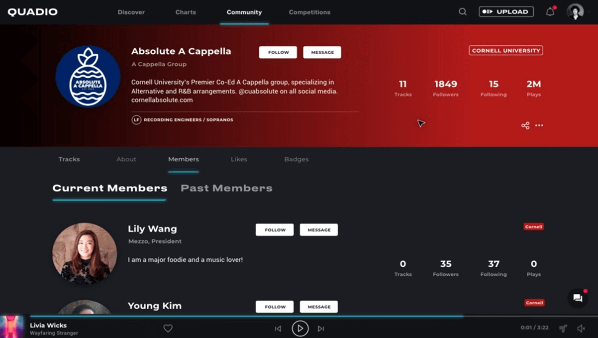 One of my main projects as an intern at Quadio, an upcoming free streaming service created specifically for college students, was to make sure that the product was not alienating certain groups of musicians, such as college a cappella groups or bands. Though I was not taken on as a UI intern specifically, I asked my supervisors for the opportunity to get involved with their UI/ UX endeavors, as I felt the experience I would get at a startup would be invaluable for my future. I was tasked with taking an existing wireframe made in Adobe XD that represented a page for a group of musicians, and creating different possible layouts to facilitate showing both present and past members of a group. In this case, the argument made by my team for this feature was that many college music groups and clubs have seniors that graduate every semester, which makes managing a list of member accounts associated with any given group much harder and more confusing. This feature would have allowed those groups to simply mark graduated seniors as previous members, and would have allowed those members to still be associated with that music group without showing as part of the current lineup.